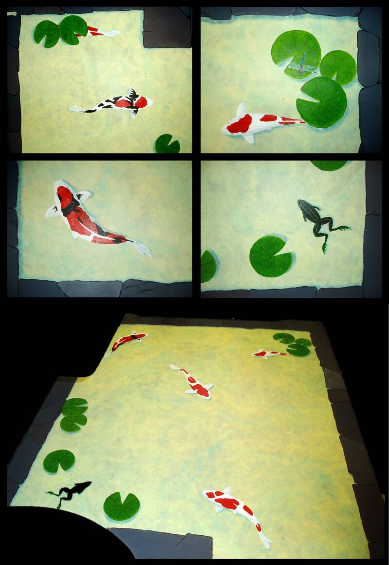 I was commissioned to do a friend's bathroom floor as a koi pond. This is what I came up with.